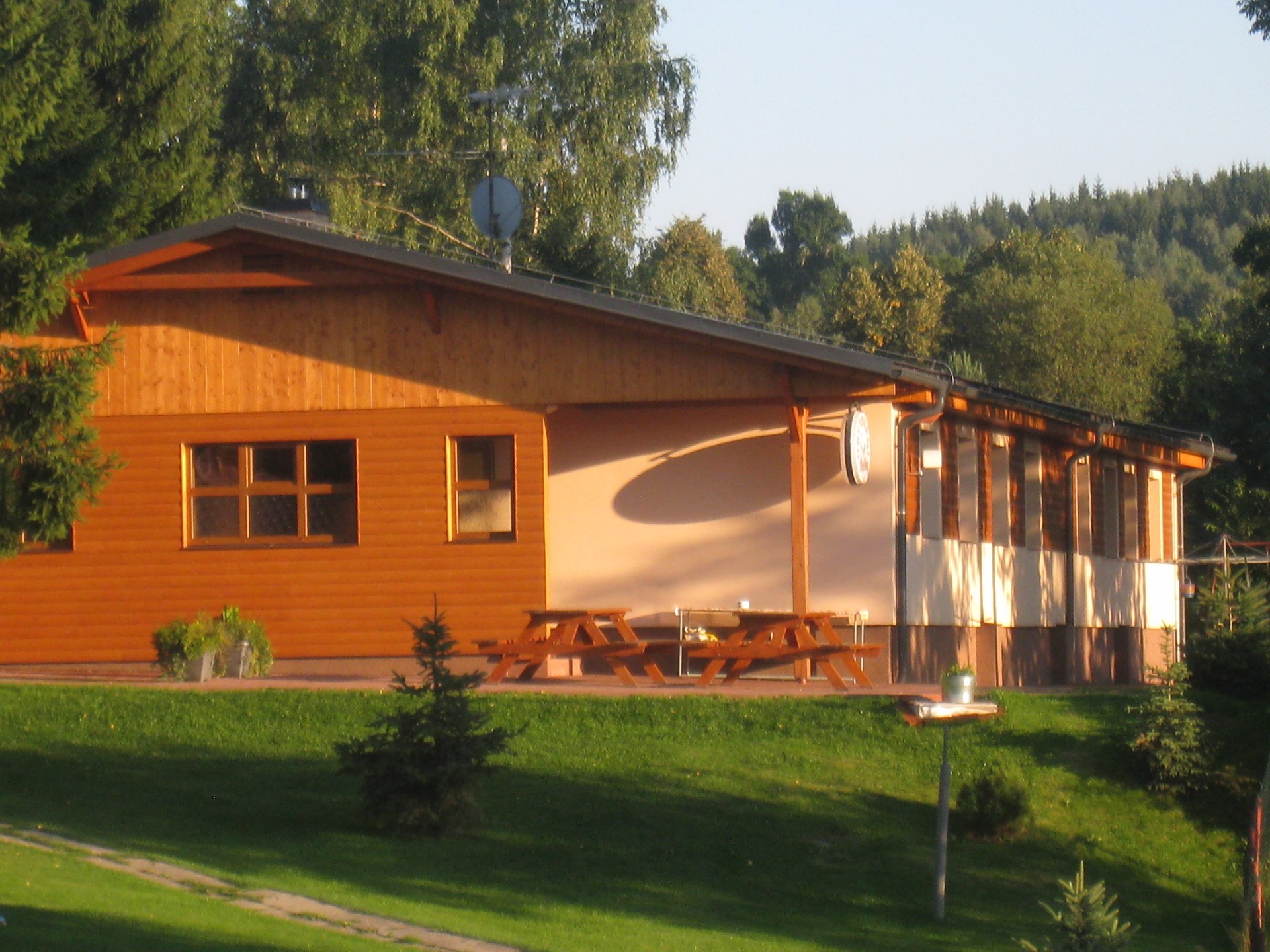 Ubytování ve 3-5lůžkových pokojích, velká stylově upravená společenská místnost s krbovými kamny, WI-FI. TV/SAT/DVD, prostorná plně vybavená kuchyň, úschovna kol, kočárků, vytápěná lyžárna a sušárna bot, Wellness – relaxační místnost s hydromasážní a vířivou vanou.